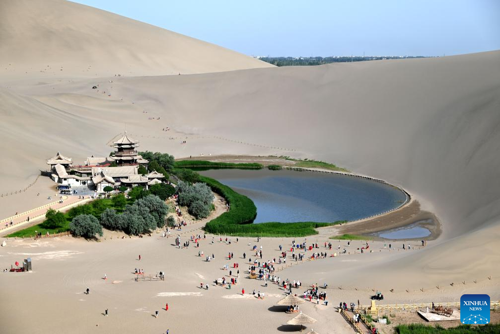 Tourists visit the Mingsha Mountain and Crescent Spring scenic spot in Dunhuang City, northwest China's Gansu Province, May 31, 2025. Crescent Spring, a famed desert oasis in northwest China's Gansu Province, has recorded its highest water level and largest surface area in over 20 years, signaling a major victory in ecological restoration efforts. (Photo by Zhang Xiaoliang/Xinhua)
