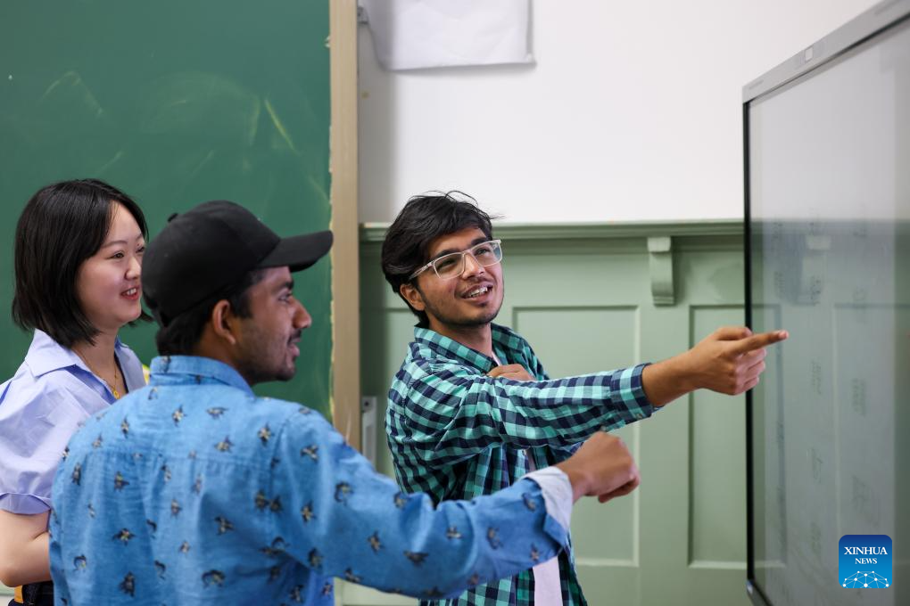 Muhammad Mohsin (R) communicates with classmates during a lecture at Tianjin International Chinese College in north China's Tianjin, July 17, 2025. (Xinhua/Sun Fanyue)