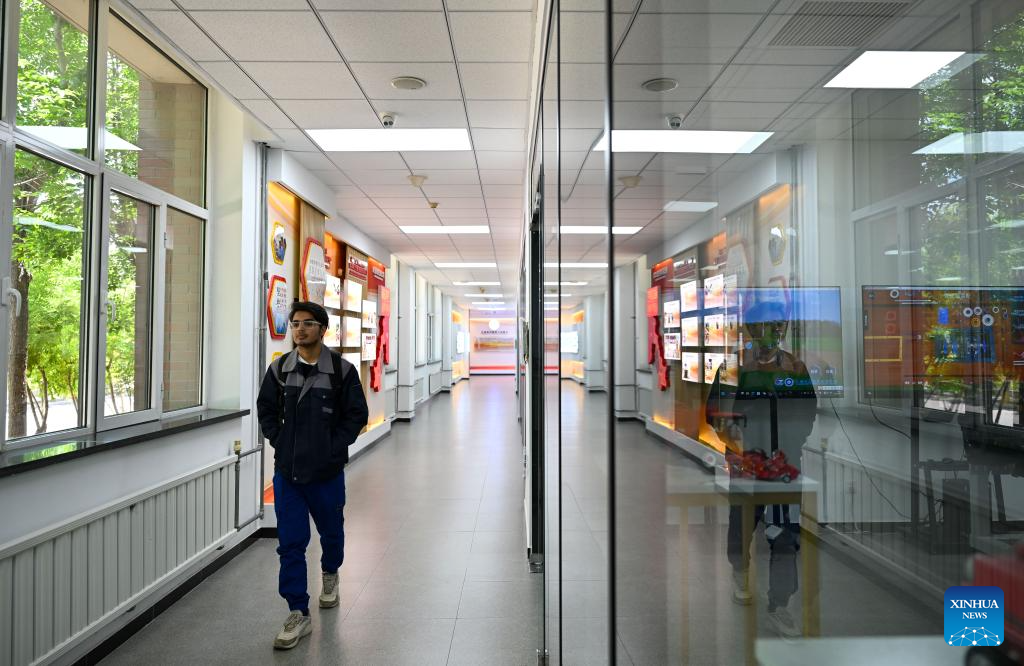 Muhammad Mohsin passes by the training classrooms at Tianjin Modern Vocational Technology College in north China's Tianjin, June 16, 2025. (Xinhua/Sun Fanyue)