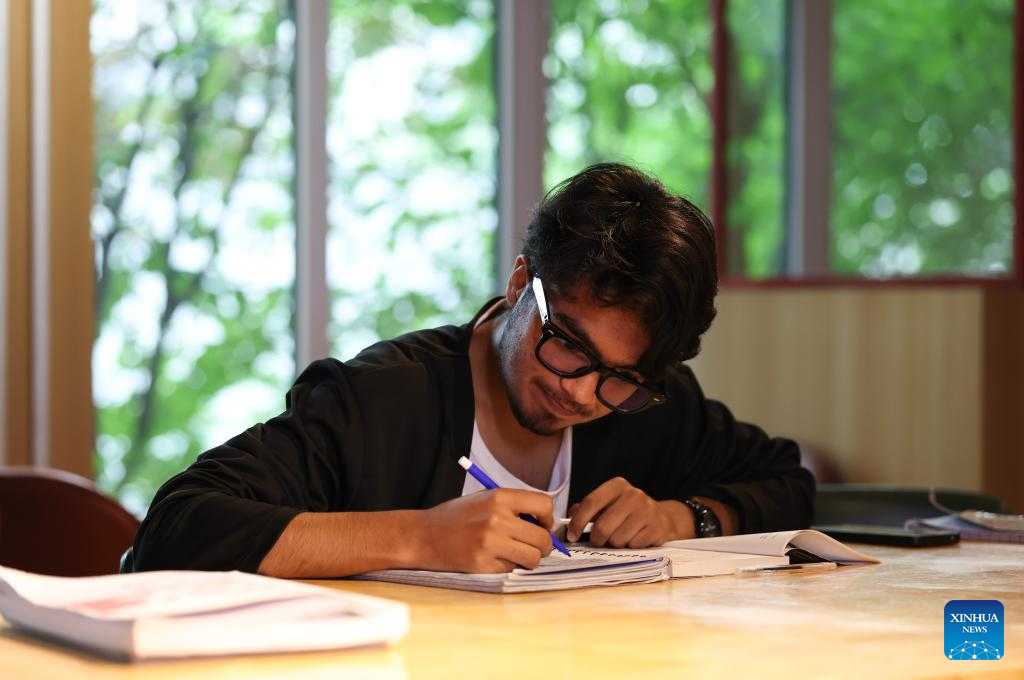 Muhammad Mohsin studies at his apartment building in north China's Tianjin, July 21, 2025. (Xinhua/Sun Fanyue)