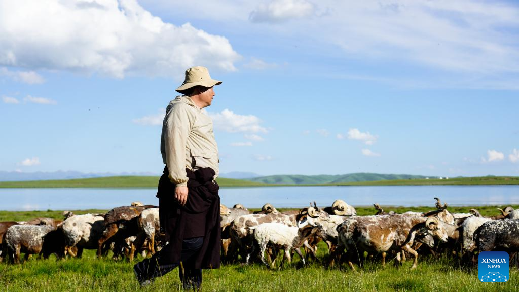 A herdsman looks after his flock on a grassland in Zeku County, Huangnan Tibetan Autonomous Prefecture, northwest China's Qinghai Province, July 30, 2025. (Xinhua/Wang Yan)
