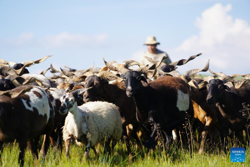 Sheep graze on a grassland in Zeku County, Huangnan Tibetan Autonomous Prefecture, northwest China's Qinghai Province, July 30, 2025. (Xinhua/Wang Yan)