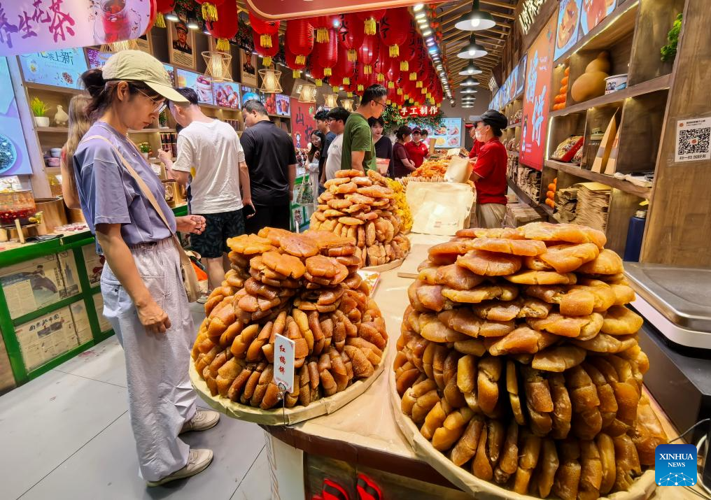 People select snacks in a store at Gulou street in Beijing, capital of China, July 30, 2025. Beijing has vigorously developed its night economy since the beginning of this summer, featuring local cuisine, outdoor films, music festivals, and night markets. (Xinhua/Li Xin)