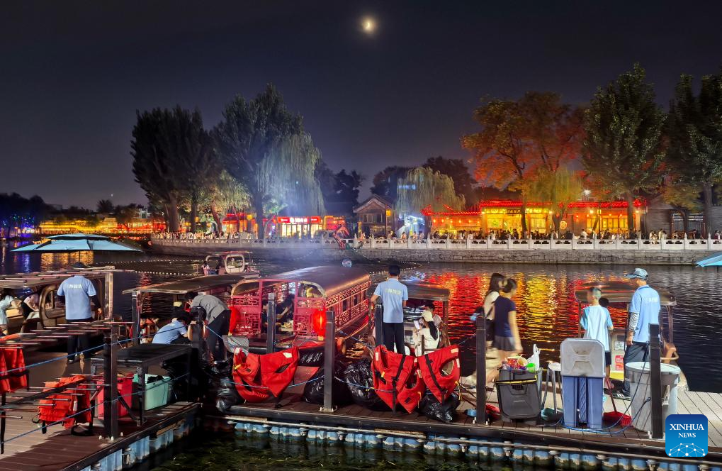 Visitors take an evening boat tour at Houhai scenic area in Beijing, capital of China, July 30, 2025. Beijing has vigorously developed its night economy since the beginning of this summer, featuring local cuisine, outdoor films, music festivals, and night markets. (Xinhua/Li Xin)