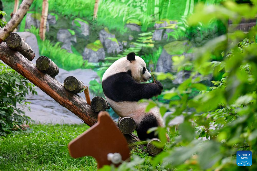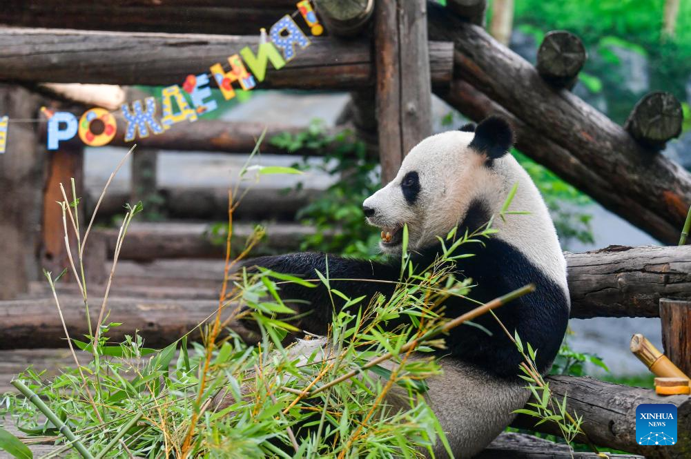 Giant panda Ru Yi is pictured at the Moscow Zoo in Moscow, Russia on July 31, 2025. The Moscow Zoo held an event to celebrate giant panda Ru Yi's birthday on Thursday. (Xinhua/Zhang Chaoqun)