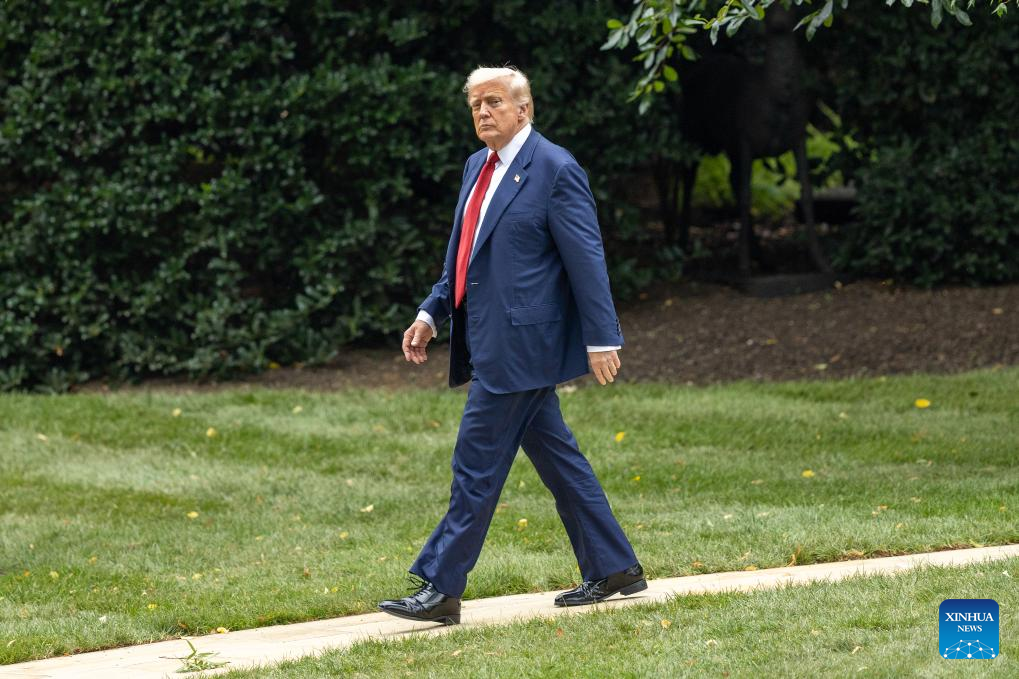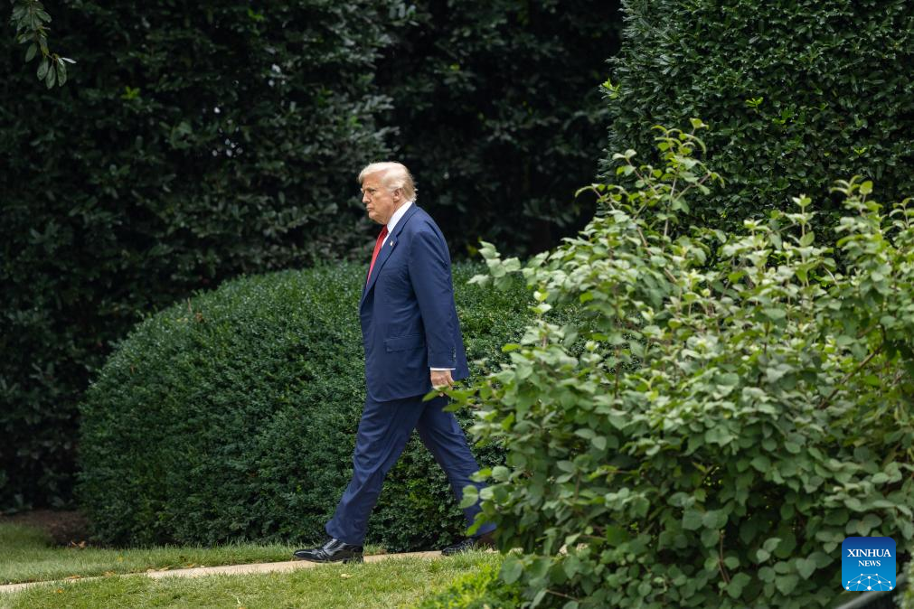 U.S. President Donald Trump walks to the South Lawn of the White House in Washington, D.C., the United States, on Aug. 1, 2025. U.S. President Donald Trump on Friday announced that he has ordered the firing of Erika McEntarfer, commissioner of the Bureau of Labor Statistics (BLS), accusing her of manipulating data for political purposes. (Xinhua/Hu Yousong)