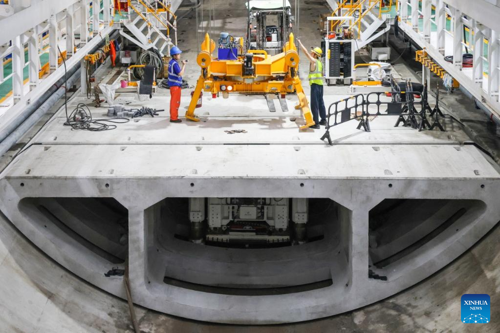 Workers work at the construction site of a tunnel in Pingshan, Shenzhen City, south China's Guangdong Province, Aug. 1, 2025. A giant tunnel boring machine started operation on Friday to spearhead the excavation works for a tunnel along a railway linking Shenzhen and Shanwei special cooperation zone in Shenzhen.