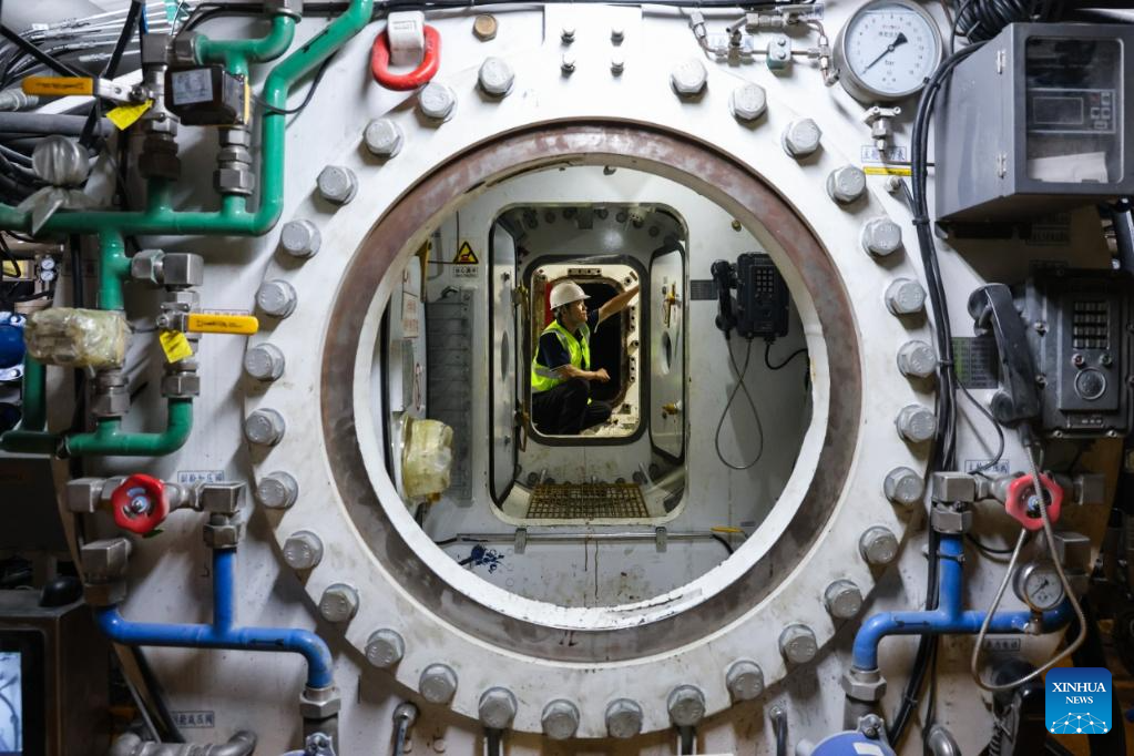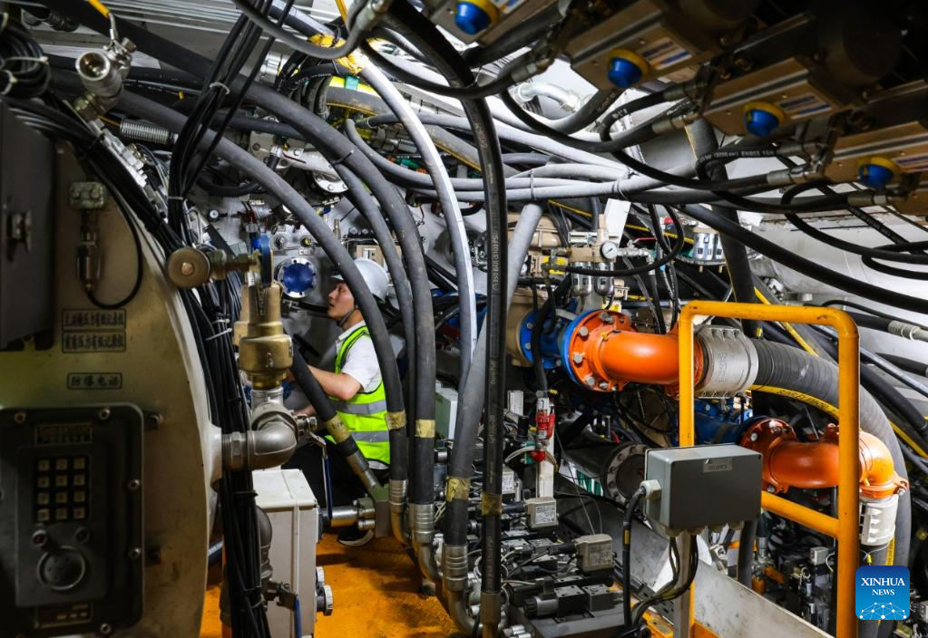 A technician checks a tunnel boring machine (TBM) at the construction site of a tunnel in Pingshan, Shenzhen City, south China's Guangdong Province, Aug. 1, 2025. A giant tunnel boring machine started operation on Friday to spearhead the excavation works for a tunnel along a railway linking Shenzhen and Shanwei special cooperation zone in Shenzhen.