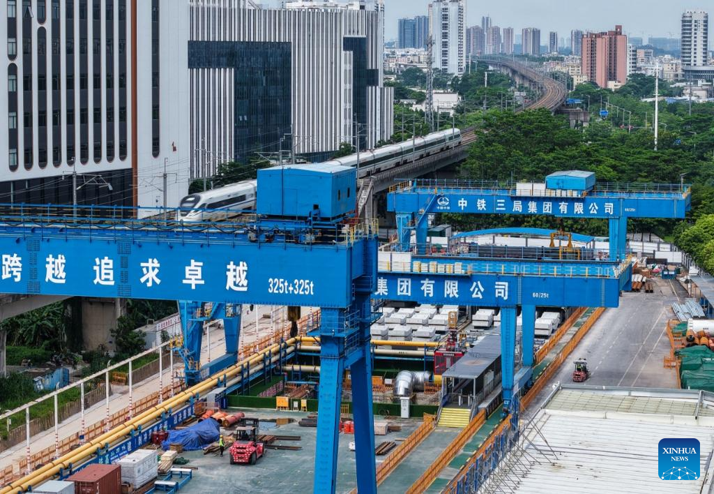 A drone photo shows Xiamen-Shenzhen Railway along the construction site of a tunnel in Pingshan, Shenzhen City, south China's Guangdong Province, Aug. 1, 2025. A giant tunnel boring machine started operation on Friday to spearhead the excavation works for a tunnel along a railway linking Shenzhen and Shanwei special cooperation zone in Shenzhen.