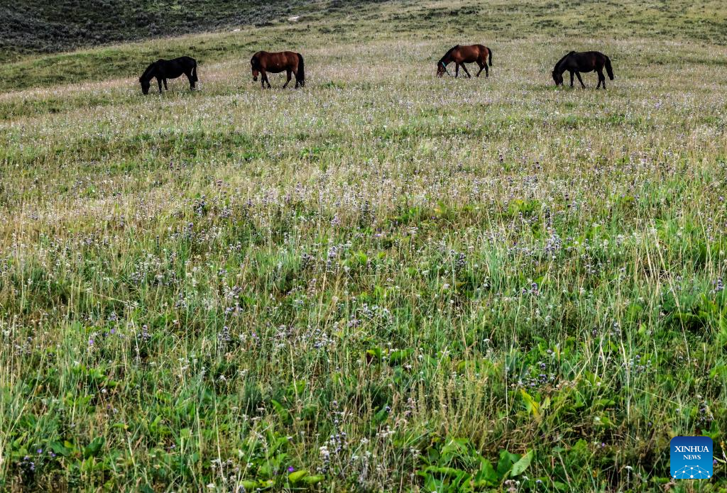 Horses are pictured at a scenic spot in Wusu City, northwest China's Xinjiang Uygur Autonomous Region, July 29, 2025. In recent days, multiple areas in Xinjiang have experienced sustained high temperatures, prompting residents and tourists to seek relief in cooler scenic spots.