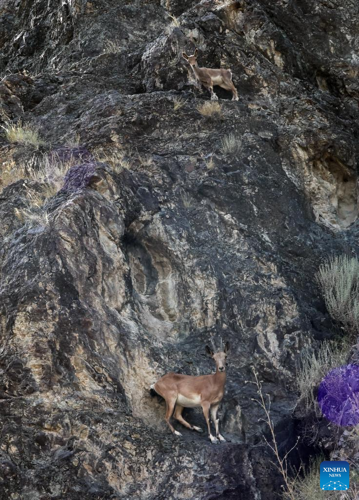 Antelopes are pictured at a scenic spot in Wusu City, northwest China's Xinjiang Uygur Autonomous Region, July 29, 2025. In recent days, multiple areas in Xinjiang have experienced sustained high temperatures, prompting residents and tourists to seek relief in cooler scenic spots.