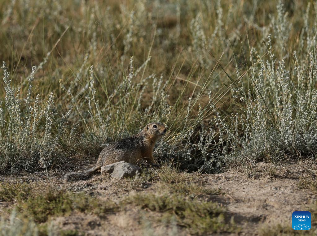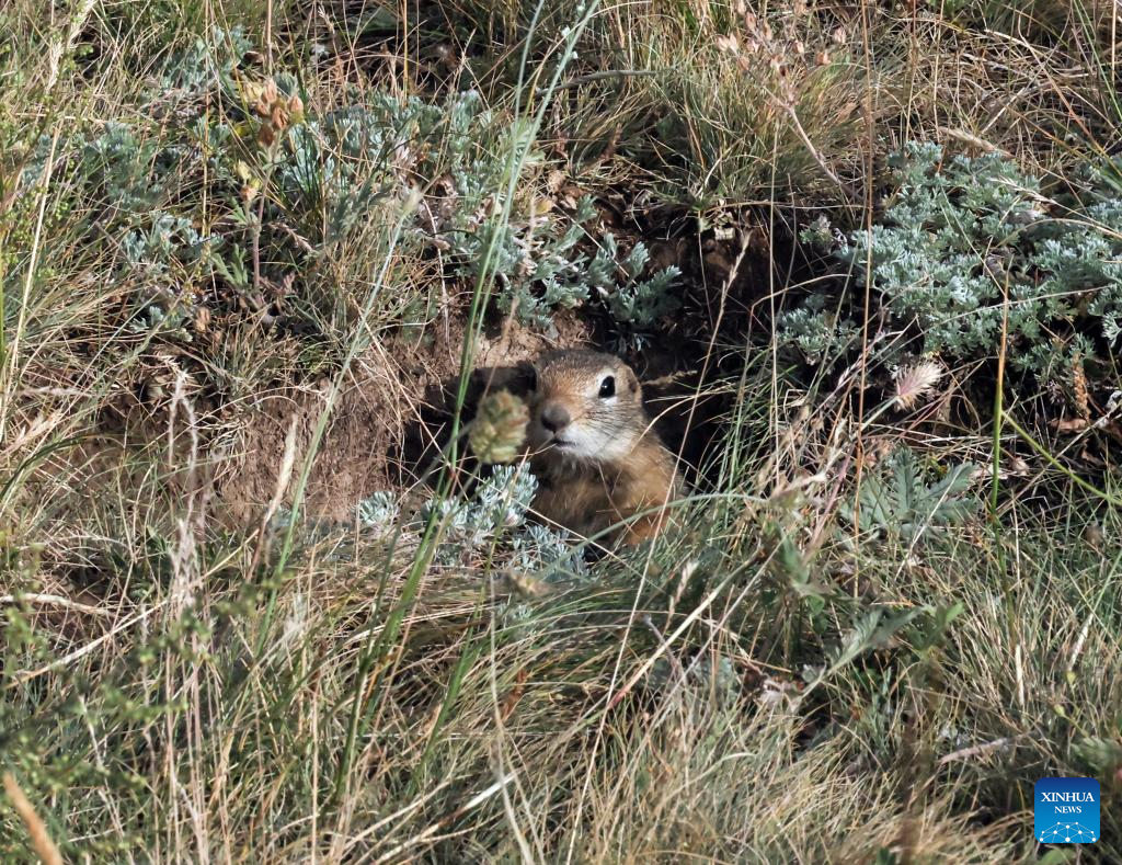 A marmot is pictured at a scenic spot in Wusu City, northwest China's Xinjiang Uygur Autonomous Region, July 29, 2025. In recent days, multiple areas in Xinjiang have experienced sustained high temperatures, prompting residents and tourists to seek relief in cooler scenic spots.