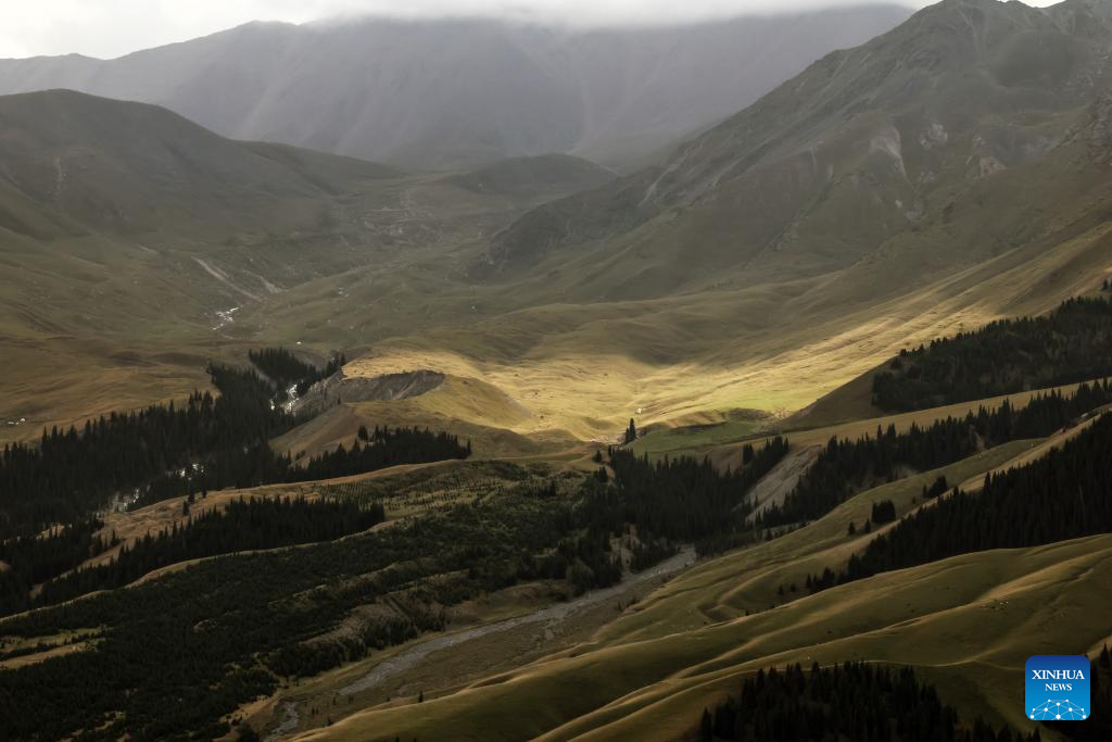 This photo taken on July 28, 2025 shows a view of Foshan National Forest Park in Wusu City, northwest China's Xinjiang Uygur Autonomous Region. In recent days, multiple areas in Xinjiang have experienced sustained high temperatures, prompting residents and tourists to seek relief in cooler scenic spots.