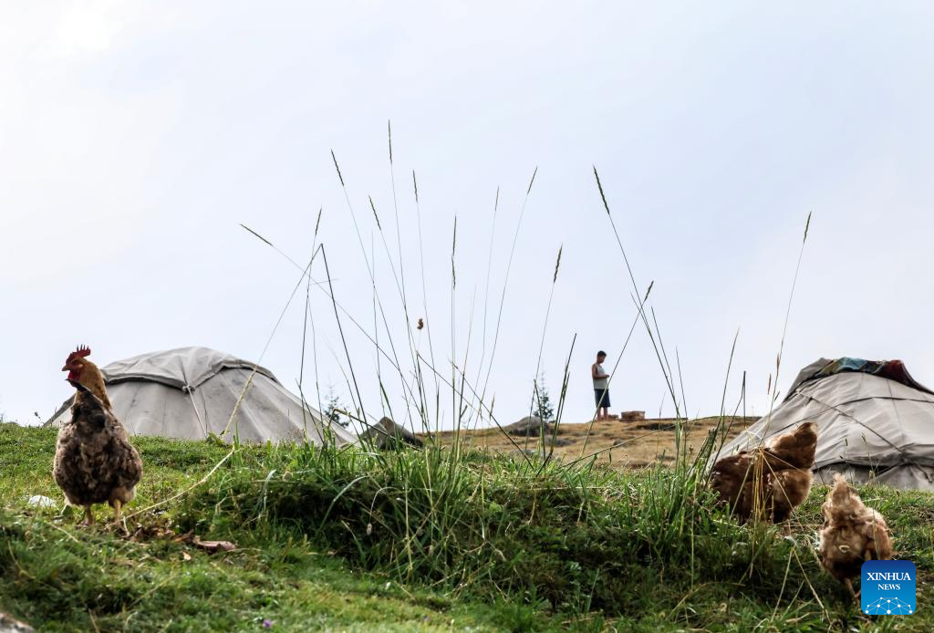 A woman holding a child is pictured in front of a yurt in Wusu City, northwest China's Xinjiang Uygur Autonomous Region, July 29, 2025. In recent days, multiple areas in Xinjiang have experienced sustained high temperatures, prompting residents and tourists to seek relief in cooler scenic spots.