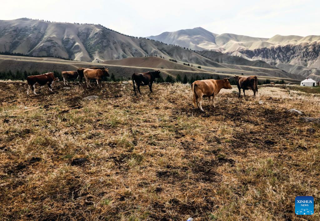 A herd of cattle is pictured at a scenic spot in Wusu City, northwest China's Xinjiang Uygur Autonomous Region, July 29, 2025. In recent days, multiple areas in Xinjiang have experienced sustained high temperatures, prompting residents and tourists to seek relief in cooler scenic spots.