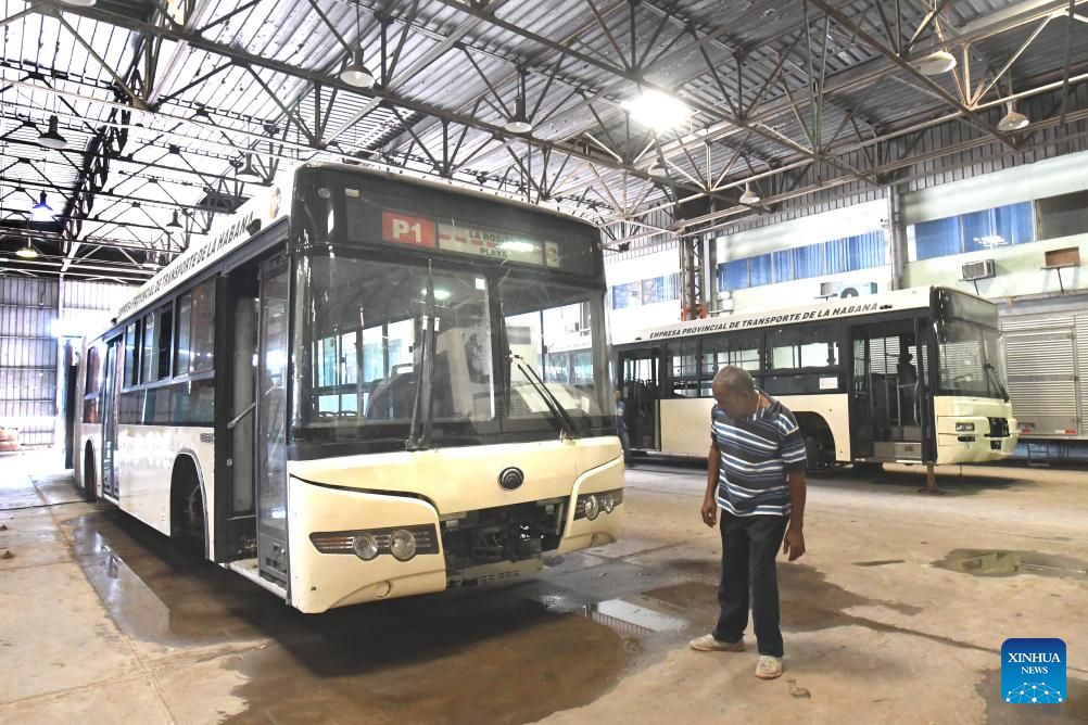 A worker checks a bus at a bus manufacturing factory in Guanajay, Cuba, on July 31, 2025. The handover ceremony of bus parts and accessories under a Chinese government assistance project to Cuba for bus repair and rehabilitation was held here on Thursday. (Photo by Joaquin Hernandez/Xinhua)