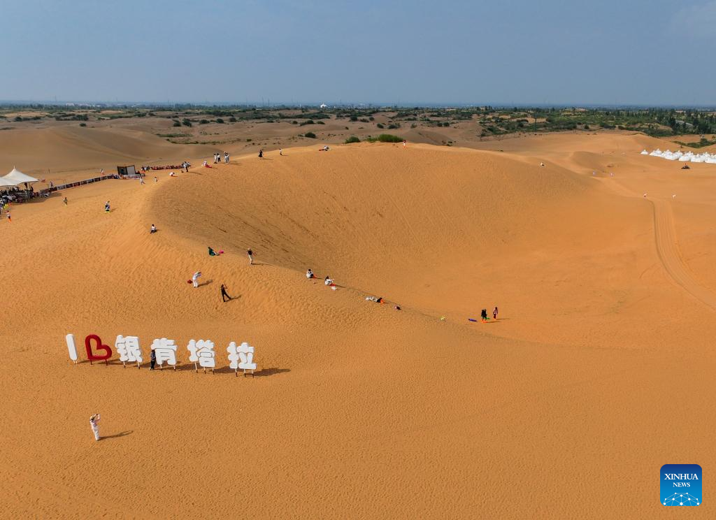 Tourists visit a desert scenic area in Dalad Banner of Erdos City, north China's Inner Mongolia Autonomous Region, Aug. 1, 2025. Kubuqi desert in Erdos City has entered its peak tourist season in midsummer, attracting numerous tourists from around the country to visit. (Xinhua/Lian Zhen)