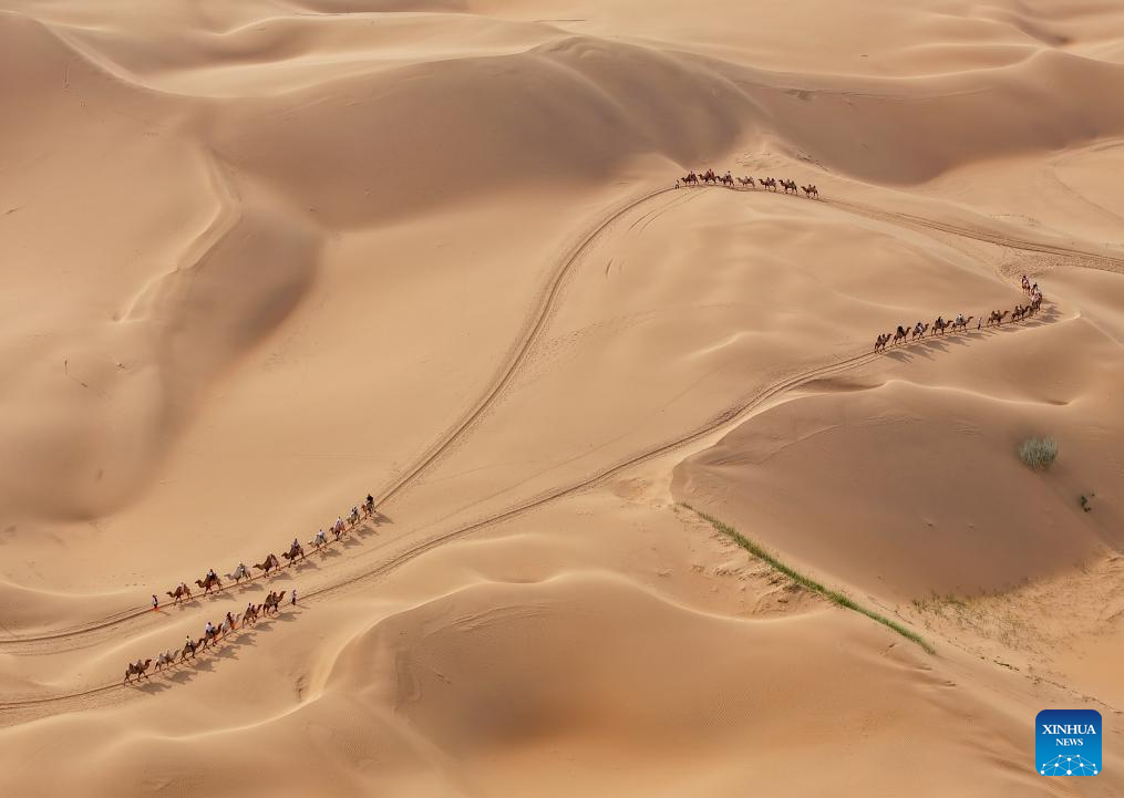 An aerial drone photo taken on Aug. 1, 2025 shows people riding camels at a desert scenic area in Dalad Banner of Erdos City, north China's Inner Mongolia Autonomous Region. Kubuqi desert in Erdos City has entered its peak tourist season in midsummer, attracting numerous tourists from around the country to visit. (Xinhua/Lian Zhen)