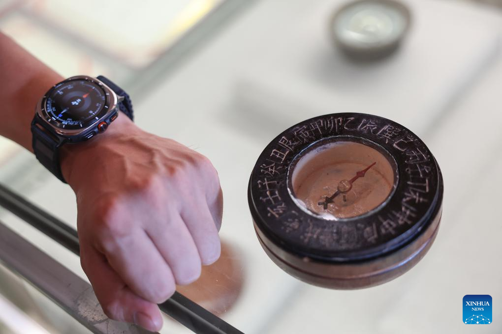A visitor compares a compass with an exhibiting old compass at a museum in Qionghai, south China's Hainan Province, July 31, 2025. (Xinhua/Zhang Liyun)
