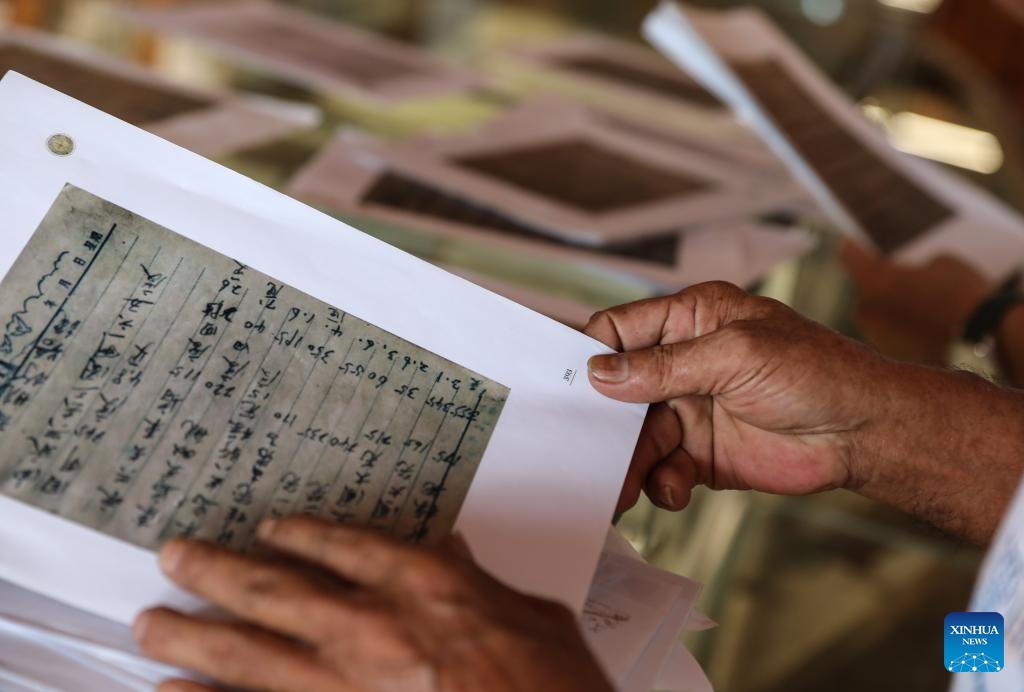 Wang Shubao arranges copies of Geng Lu Bu at a museum in Qionghai, south China's Hainan Province, July 22, 2025. (Xinhua/Cheng Tingting)