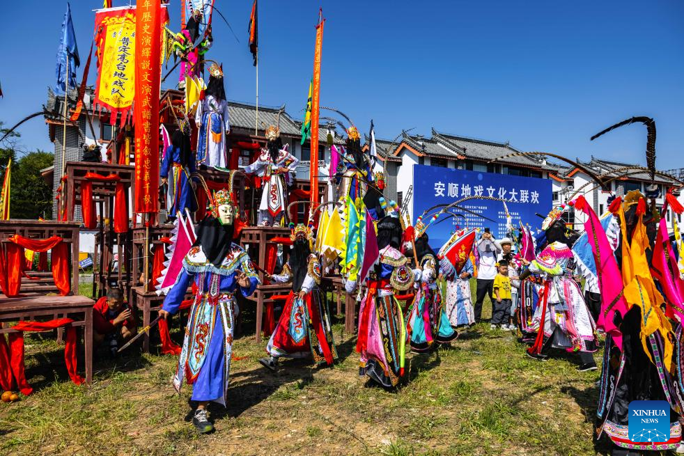 Actors take part in a Dixi opera parade at the Miaoling Tunpu scenic area in Xixiu District of Anshun City, southwest China's Guizhou Province, Aug. 2, 2025. Anshun Dixi Opera is an important part of Tunpu culture dating back to the Ming Dynasty (1368-1644). The opera has been listed as a national intangible cultural heritage item in 2006. (Photo by Chen Xi/Xinhua)