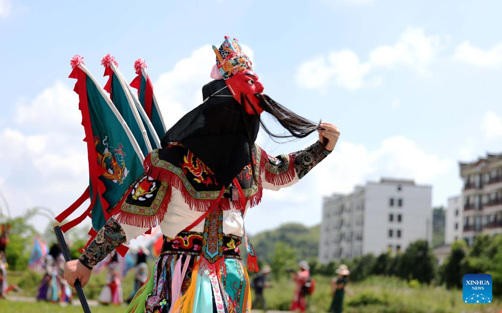 Actors stage a Dixi opera performance at the Miaoling Tunpu scenic area in Xixiu District of Anshun City, southwest China's Guizhou Province, Aug. 2, 2025. Anshun Dixi Opera is an important part of Tunpu culture dating back to the Ming Dynasty (1368-1644). The opera has been listed as a national intangible cultural heritage item in 2006. (Photo by Fan Hui/Xinhua)