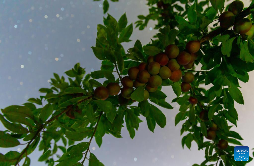 This photo taken on July 28, 2025 shows plums under the starry sky in Jiamusi City, northeast China's Heilongjiang Province. Heilongjiang Province, a major agricultural producer dubbed "China's grain barn," have seen its crops enter the ripening stage recently. (Photo by Zhu Zongqiang/Xinhua)