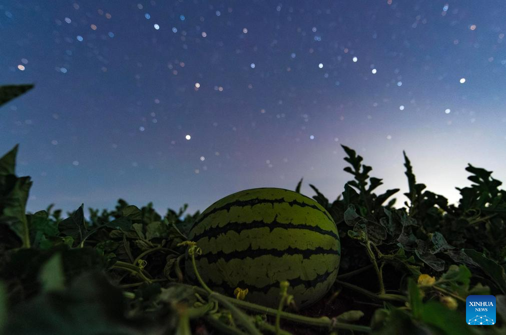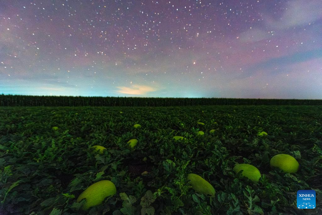 This photo taken on July 23, 2025 shows watermelons in a field under the starry sky in Shangjieji Town of Fujin City, northeast China's Heilongjiang Province. Heilongjiang Province, a major agricultural producer dubbed "China's grain barn," have seen its crops enter the ripening stage recently. (Photo by Qu Yubao/Xinhua)