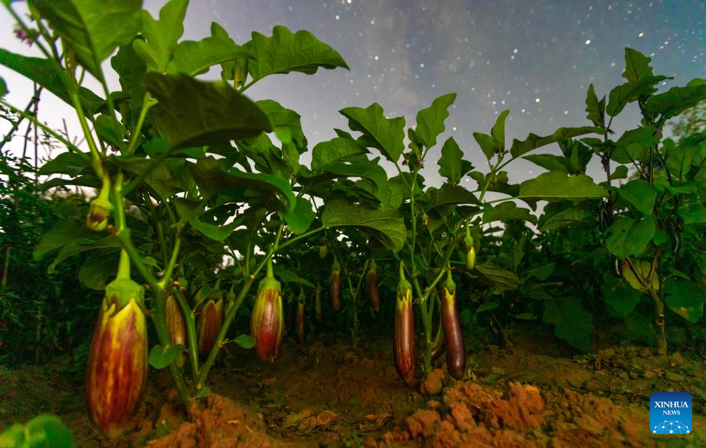 This photo taken on July 26, 2025 shows eggplants in a field under the starry sky in Lianjiangkou Town of Jiamusi City, northeast China's Heilongjiang Province. Heilongjiang Province, a major agricultural producer dubbed "China's grain barn," have seen its crops enter the ripening stage recently. (Photo by Zhu Zongqiang/Xinhua)