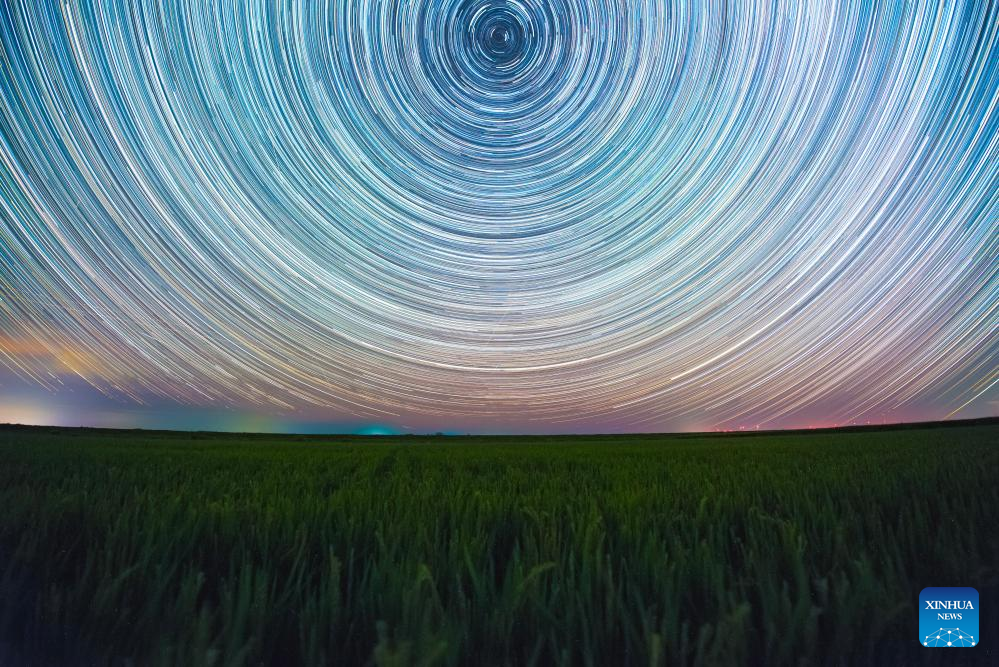 This photo taken on July 27, 2025 shows a wheat field under the starry sky in Heihe City, northeast China's Heilongjiang Province. Heilongjiang Province, a major agricultural producer dubbed "China's grain barn," have seen its crops enter the ripening stage recently. (Photo by Qian Boyu/Xinhua)