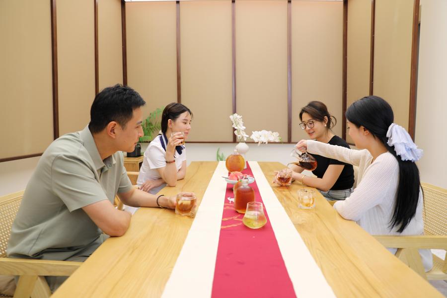 People try new-style tea drinks at a teahouse in Tunxi District of Huangshan City, east China's Anhui Province, on July 15, 2025. (Xinhua/Cao Li)