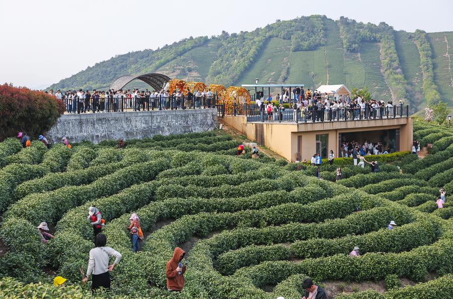 People visit a tea garden in Anji County of Huzhou City, east China's Zhejiang Province, on April 5, 2025. (Xinhua)