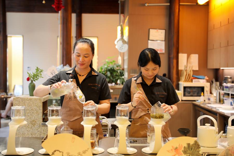 Staff members make new-style tea drinks at a teahouse in Tunxi District of Huangshan City, east China's Anhui Province, on July 15, 2025. (Xinhua/Cao Li)