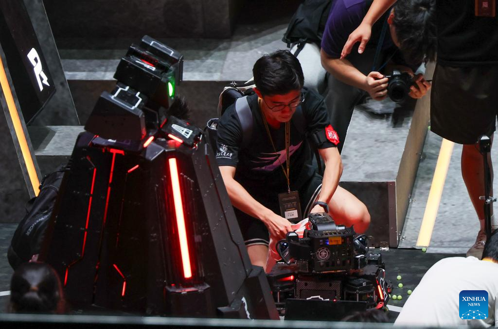A member of Jiaoloong team from Shanghai Jiao Tong University sets up a robot during the RoboMaster University Championship (RMUC 2025) Final of the 24th China University Robot Competition, in Shenzhen, south China's Guangdong Province, Aug. 3, 2025. The competition was concluded here on Sunday, with Jiaoloong team from Shanghai Jiao Tong University winning the championship. (Xinhua/Mao Siqian)
