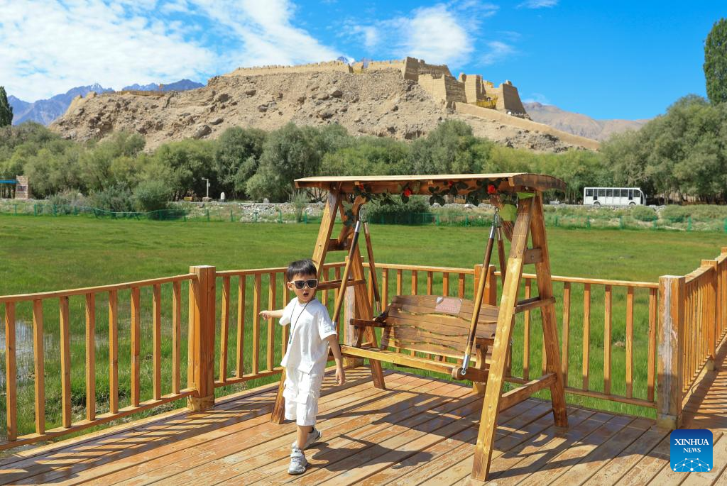 A boy has fun at a national wetland park in Tajik Autonomous County of Taxkorgan, northwest China's Xinjiang Uygur Autonomous Region, Aug. 2, 2025. Tajik Autonomous County of Taxkorgan has entered the peak travel season as more tourists come here to experience the culture and enjoy the scenery on the plateau. (Xinhua/Wang Fei)