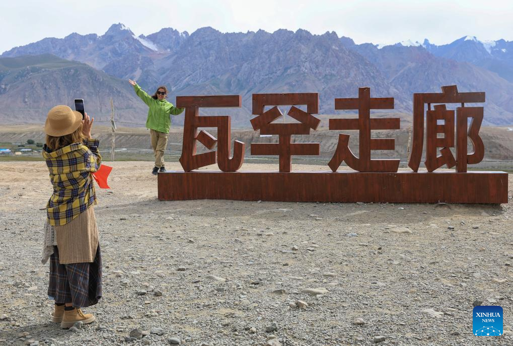 A visitor poses for photos at a corridor in Tajik Autonomous County of Taxkorgan, northwest China's Xinjiang Uygur Autonomous Region, Aug. 2, 2025. Tajik Autonomous County of Taxkorgan has entered the peak travel season as more tourists come here to experience the culture and enjoy the scenery on the plateau. (Xinhua/Wang Fei)