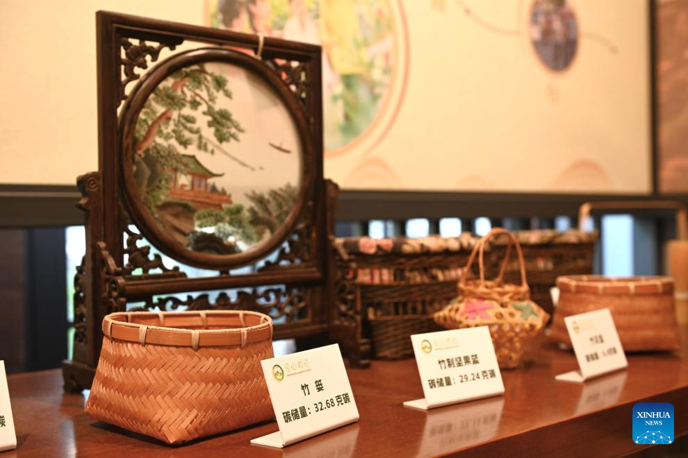 This photo taken on Aug. 5, 2025 shows cultural and creative products made of bamboo at Jingshan Village in Yuhang District of Hangzhou City, east China's Zhejiang Province. Jingshan Village, located in Yuhang District of Hangzhou City, east China's Zhejiang Province, is celebrated for its top-notch forest coverage rate of over 96 percent.