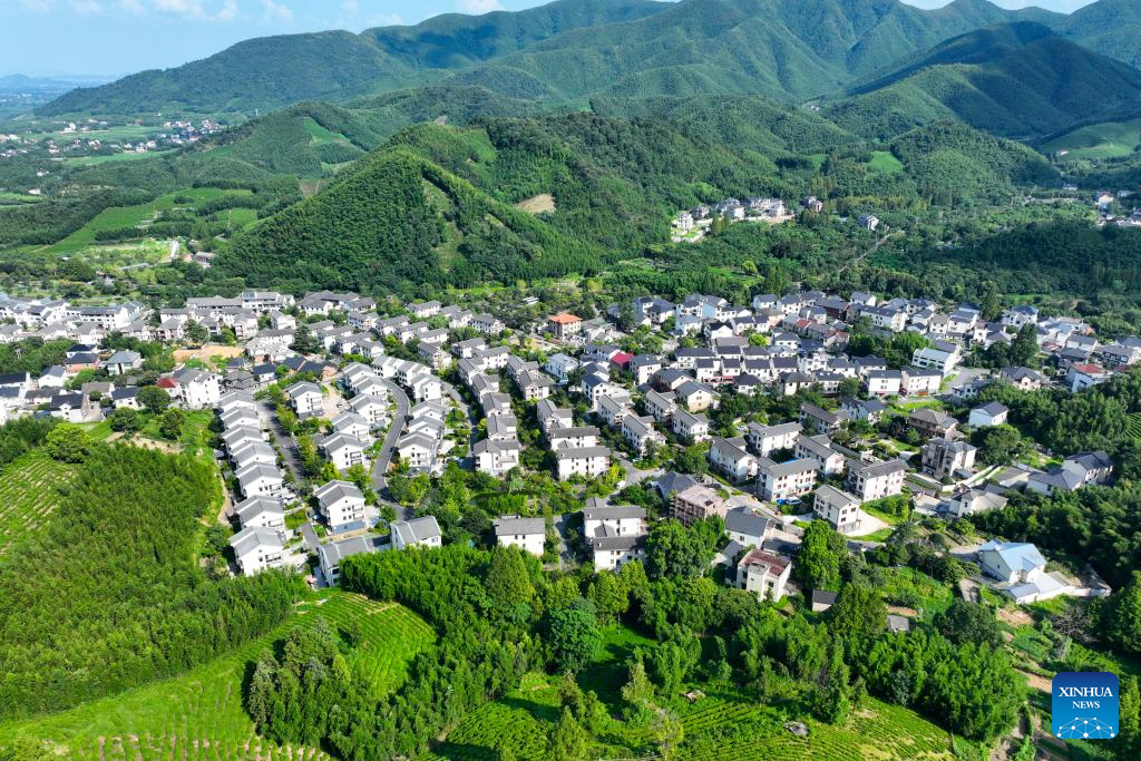 An aerial drone photo taken on Aug. 5, 2025 shows a view of Jingshan Village in Yuhang District of Hangzhou City, east China's Zhejiang Province. Jingshan Village, located in Yuhang District of Hangzhou City, east China's Zhejiang Province, is celebrated for its top-notch forest coverage rate of over 96 percent.