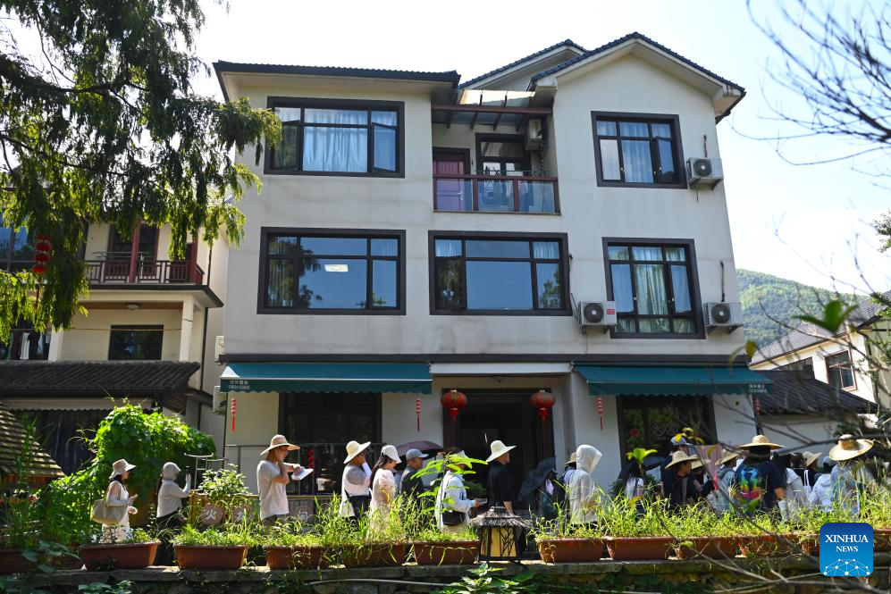 Tourists walk past a low-carbon homestay at Jingshan Village in Yuhang District of Hangzhou City, east China's Zhejiang Province, Aug. 5, 2025. Jingshan Village, located in Yuhang District of Hangzhou City, east China's Zhejiang Province, is celebrated for its top-notch forest coverage rate of over 96 percent.