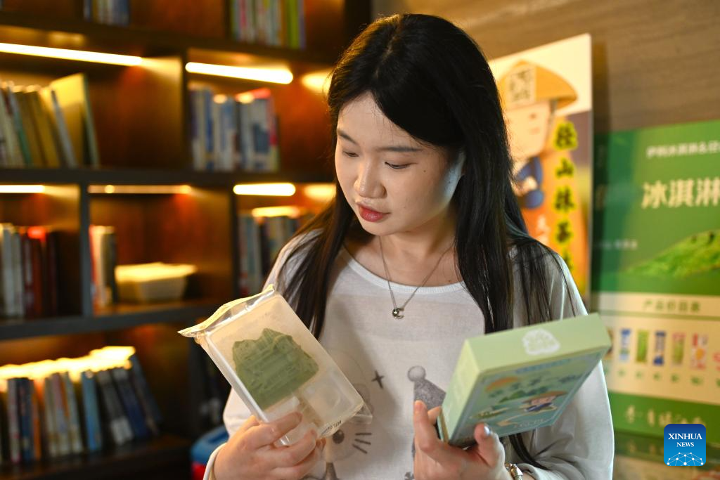 A tourist learns about a tea-flavoured popsicle at Jingshan Village in Yuhang District of Hangzhou City, east China's Zhejiang Province, Aug. 5, 2025. Jingshan Village, located in Yuhang District of Hangzhou City, east China's Zhejiang Province, is celebrated for its top-notch forest coverage rate of over 96 percent.