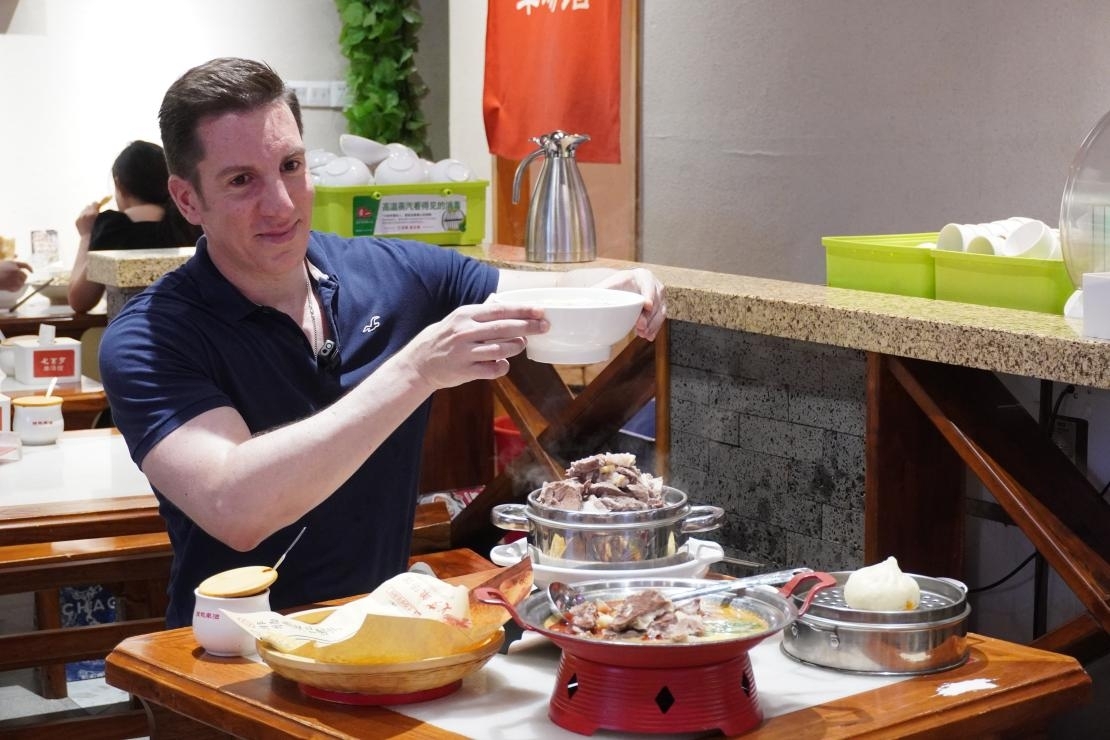 Spanish traveler Alvaro Lago tastes Xuzhou-style mutton broth in Xuzhou, east China's Jiangsu Province, August 1, 2025. (People's Daily Online/Yu Liang)