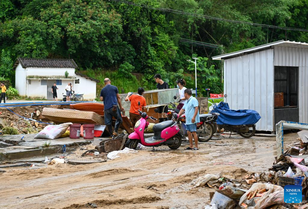 Villagers move flood-damaged furniture in Huanghua Village of Qingyuan City, south China's Guangdong Province, Aug. 6, 2025. China's national commission for disaster prevention, reduction and relief on Wednesday initiated a Level-IV emergency response in Guangdong Province due to heavy rainfall and severe flooding, according to the Ministry of Emergency Management. The southern province has been experiencing heavy rain since the beginning of the week, with the provincial meteorological observatory alarming about geological disasters, urban waterlogging and mountain torrents. (Xinhua/Xiao Ennan)