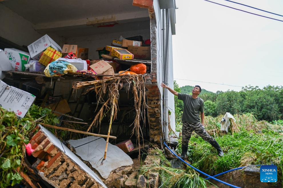 A village Party chief checks a flood-damaged house in Huanghua Village of Qingyuan City, south China's Guangdong Province, Aug. 6, 2025. China's national commission for disaster prevention, reduction and relief on Wednesday initiated a Level-IV emergency response in Guangdong Province due to heavy rainfall and severe flooding, according to the Ministry of Emergency Management. The southern province has been experiencing heavy rain since the beginning of the week, with the provincial meteorological observatory alarming about geological disasters, urban waterlogging and mountain torrents. (Xinhua/Xiao Ennan)