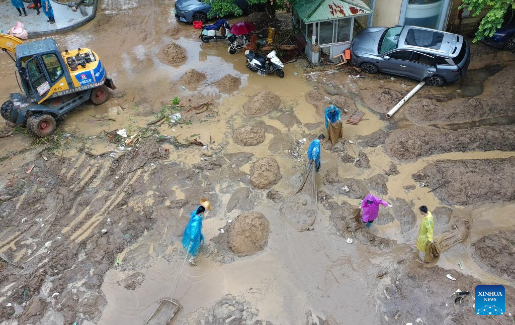 An aerial drone photo taken on Aug. 6, 2025 shows villagers clearing silt and debris in Huanghua Village of Qingyuan City, south China's Guangdong Province. China's national commission for disaster prevention, reduction and relief on Wednesday initiated a Level-IV emergency response in Guangdong Province due to heavy rainfall and severe flooding, according to the Ministry of Emergency Management. The southern province has been experiencing heavy rain since the beginning of the week, with the provincial meteorological observatory alarming about geological disasters, urban waterlogging and mountain torrents. (Xinhua/Xiao Ennan)