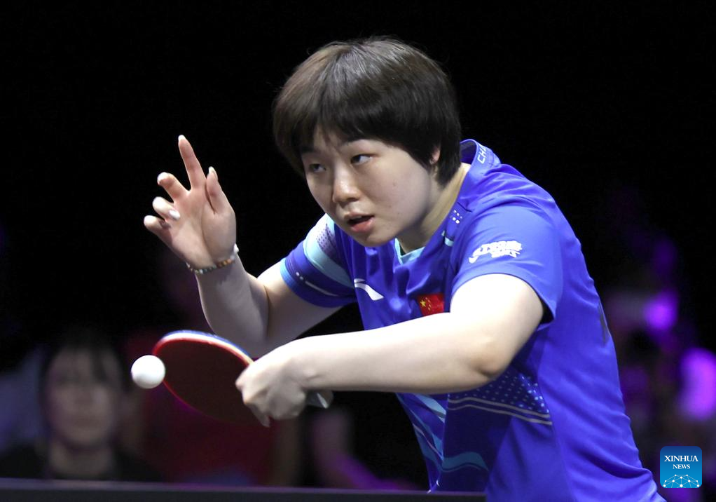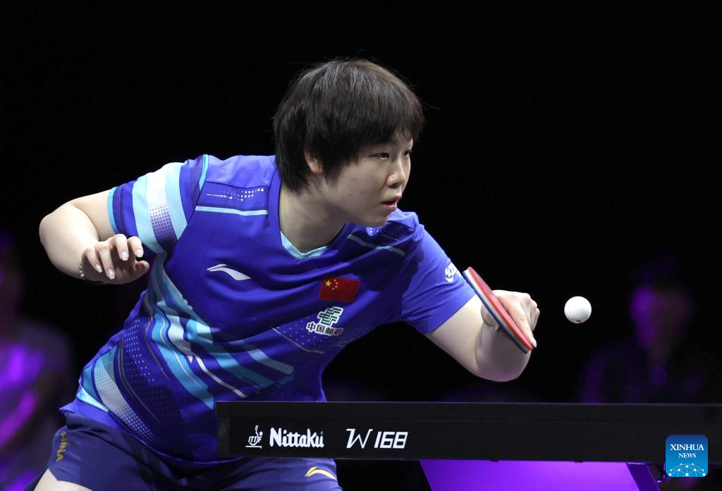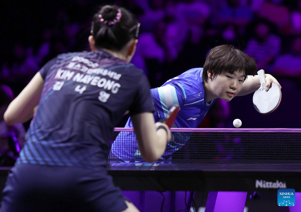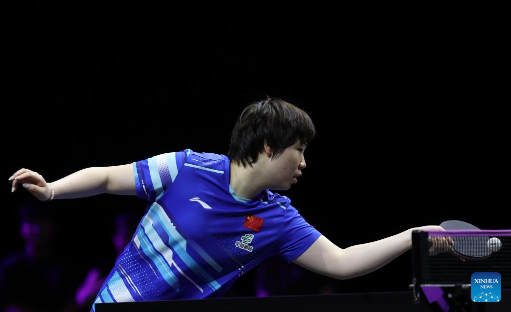 Kuai Man of China hits a return during the women's singles round of 32 match between Kuai Man of China and Kim Nayeong of South Korea at the WTT Champions Yokohama 2025 in Yokohama, Japan, Aug. 7, 2025. (Xinhua/Yue Chenxing)