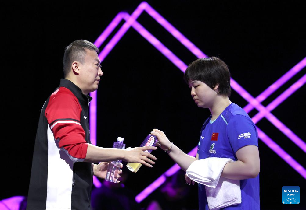 Kuai Man (R) of China talks with her coach Ma Lin during the women's singles round of 32 match between Kuai Man of China and Kim Nayeong of South Korea at the WTT Champions Yokohama 2025 in Yokohama, Japan, Aug. 7, 2025. (Xinhua/Yue Chenxing)