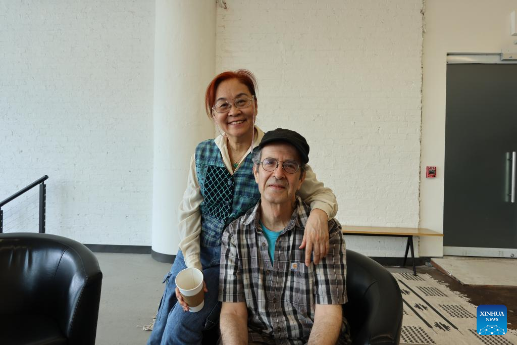 Kuang-Yu Fong (L) and Stephen Kaplin pose for a photo at Chinese Theatre Works in New York, the United States, on June 19, 2025. (Photo by Li Xirui/Xinhua)