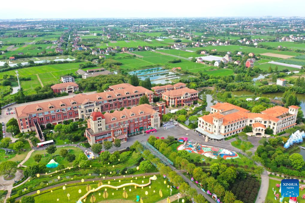 An aerial drone photo taken on Aug. 7, 2025 shows a view of Aficion Chocolate Village at Miaojia Village in Jiashan County of Jiaxing City, east China's Zhejiang Province. In recent years, Miaojia Village has developed two national-level tourist attractions, including Aficion Chocolate Village and Biyun garden, and established an intangible cultural heritage exhibition hall, promoting the integrated development of ecological conservation and the economy. (Xinhua/Mao Zhu)