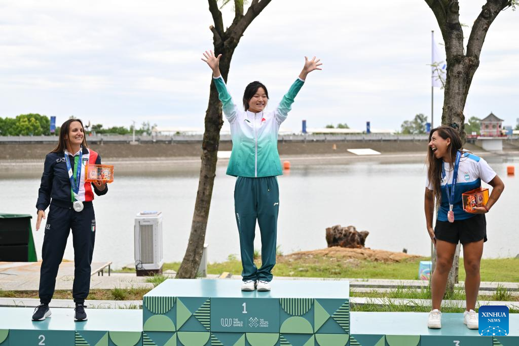 Gold medalist Xu Lu of China poses during the awarding ceremony for the women's wakeboard freestyle of Waterski & Wakeboard event at The World Games 2025 in Chengdu, southwest China's Sichuan Province, Aug. 10, 2025. (Xinhua/Chen Zhenhai)