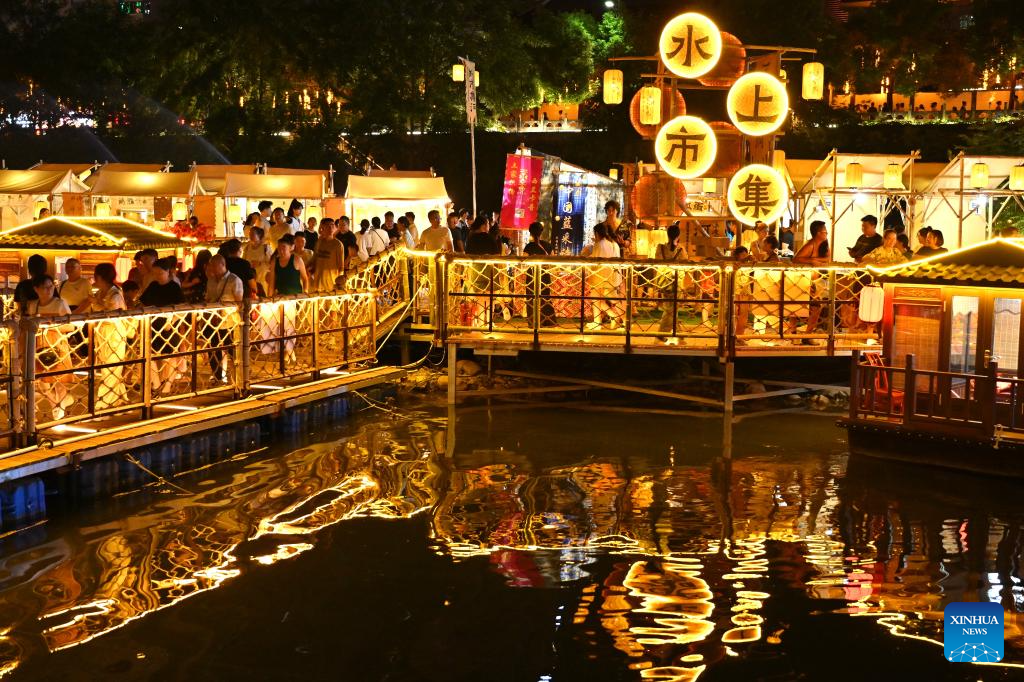 People visit a water market on the Gongshui River in Xuan'en County, Enshi Tujia and Miao Autonomous Prefecture, central China's Hubei Province, Aug. 9, 2025. The water market opened to the public here on Saturday evening. (Photo by Song Wen/Xinhua)